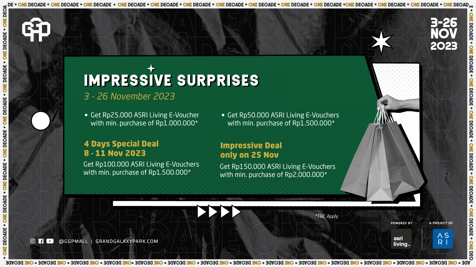 - Special program only for 25 November 2023, Get Rp150.000 ASRI Living E-Vouchers with min.purchase of Rp.2.000.000.